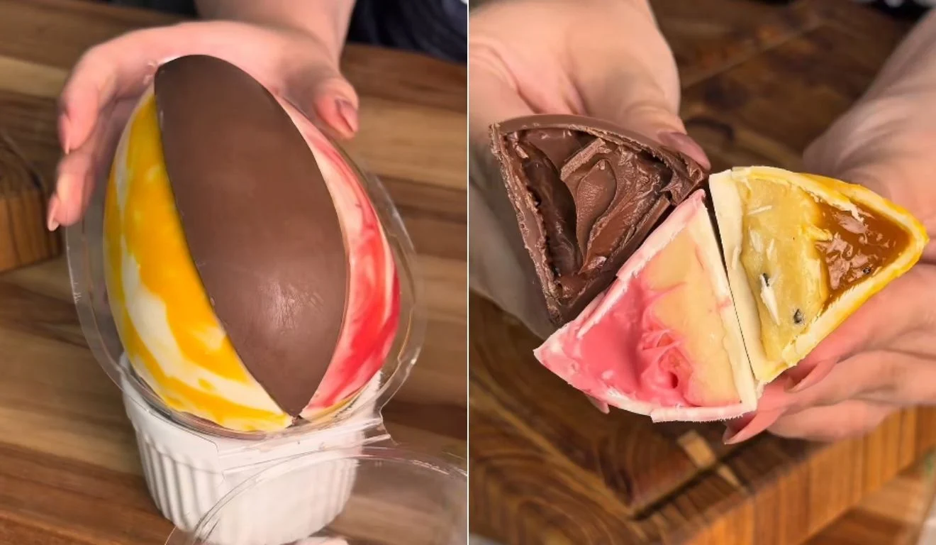 Em vez da tradicional casca oca ou das metades para comer de colher, o ovo de Páscoa em fatias é dividido em porções individuais, recheadas e separadas em quatro ou seis pedaços. Se depender das redes sociais, a sobremesa promete fazer sucesso.